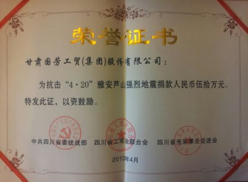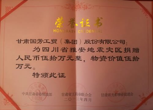 北京時(shí)間2013年4月20日8時(shí)02分,四川省雅安市蘆山縣發(fā)生7.0級(jí)大地震,作為甘肅省知名企業(yè)以及“甘肅省十大慈善單位”,國芳集團(tuán)在第一時(shí)間向?yàn)?zāi)區(qū)捐贈(zèng)50萬元現(xiàn)金和50萬元的物資,向?yàn)?zāi)區(qū)群眾送去一份愛心,這一善舉得到了廣大社會(huì)輿論的好評(píng)和百姓的良好口碑,并得到了四川、甘肅兩省,省委統(tǒng)戰(zhàn)部、省工商聯(lián)、省光彩事業(yè)促進(jìn)會(huì)的表揚(yáng)和嘉獎(jiǎng)。在此國芳集團(tuán)呼吁更多的企業(yè)能夠加入社會(huì)公益、慈善的行列里來,讓社會(huì)主義大家庭的溫暖,灑向神州大地,也祝愿雅安同胞早日遠(yuǎn)離苦難,重建家園。